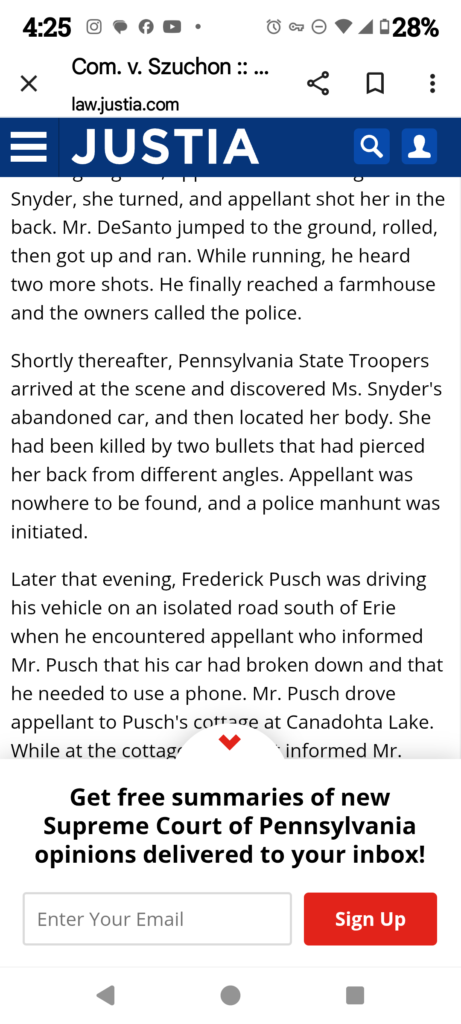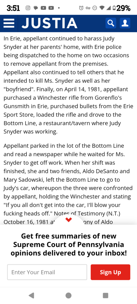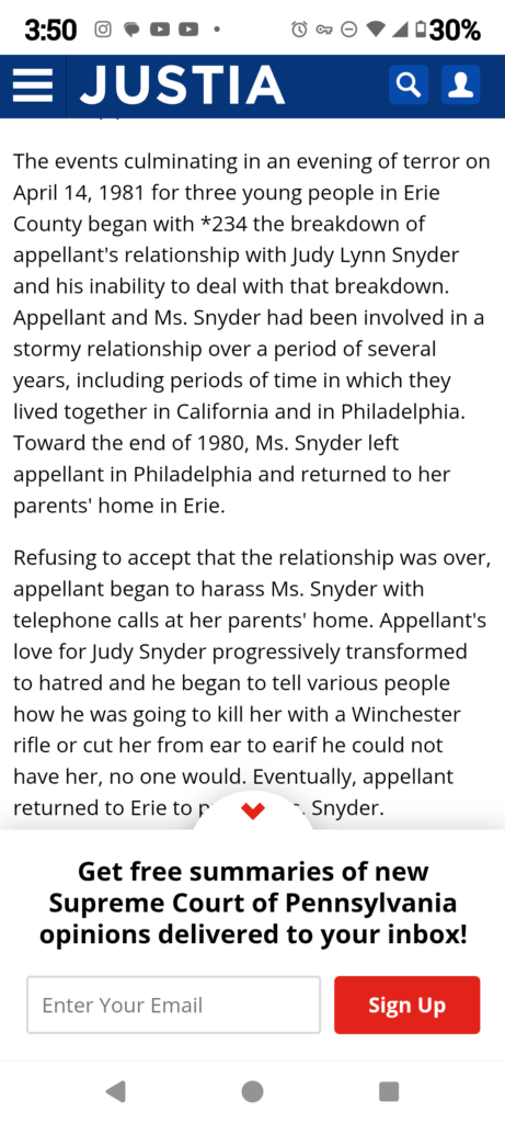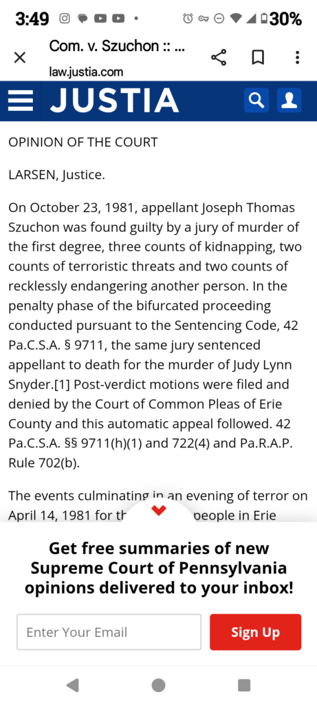 Justia online, Pennsylvania Supreme Court Record of the 1981 conviction and Appeal in the Murder of Judy Snyder.